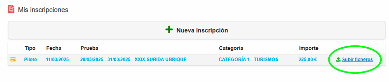 - 2º Tener Licencia de Escudería a nombre del PILOTO, en caso de no tenerla, en un enlace que pone DOCUMENTO, subir el documento de CESIÓN de la misma.
