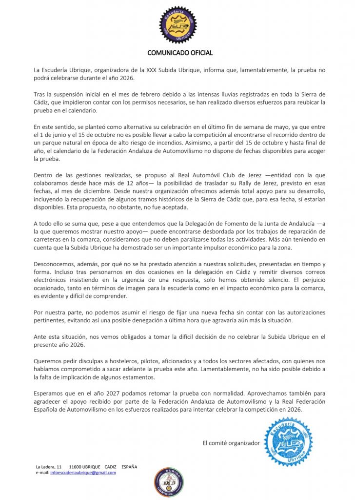 La Subida Ubrique – Benaocaz no podrá celebrarse en 2026